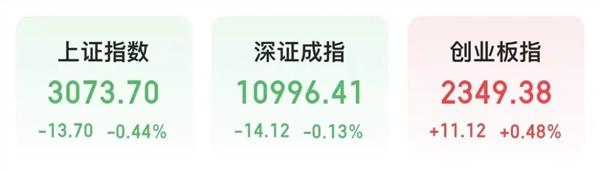 12月29日,A股三大指数走势分化。沪指全天弱势震荡,收跌0.44%,深成指跌0.13%,创业板指涨0.48%。