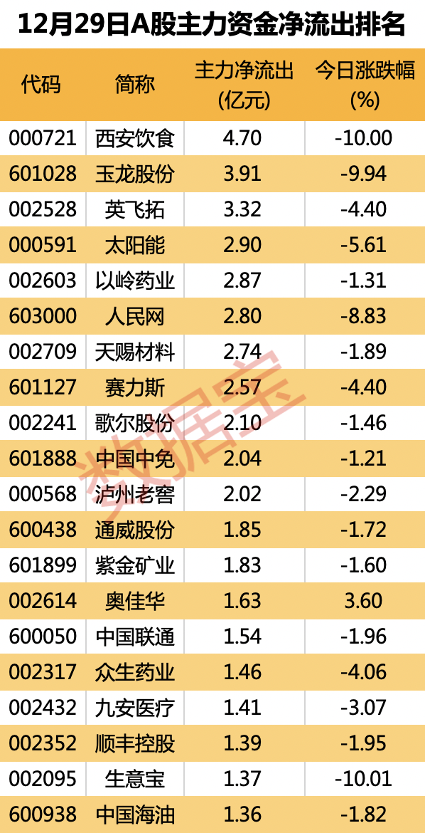 数据宝统计,29日主力资金净流出163.32亿元,电力设备、食品饮料、传媒、房地产等7个板块的净流出额超10亿元;医药生物、国防军工、美容护理和非银金融等4个板块获主力小幅净流入。除去近一个月上市的新股,多只尾盘跳水的高位股位列主力资金净流出的榜单。