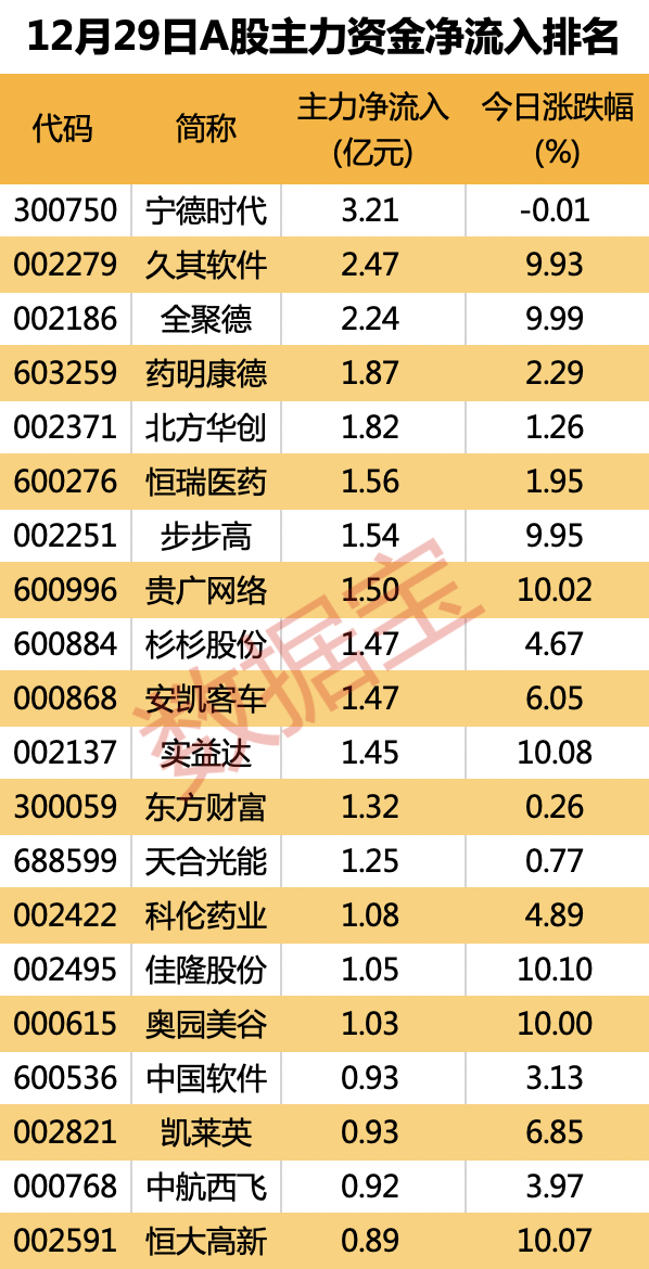 数据宝统计,宁德时代获得3.21亿元的主力资金净流入。该股12月29日出现2.3亿元溢价大宗交易,成交价为403元/股,买方为中信建投宁德蕉城南路营业部,卖方为中信建投福州东街营业部。