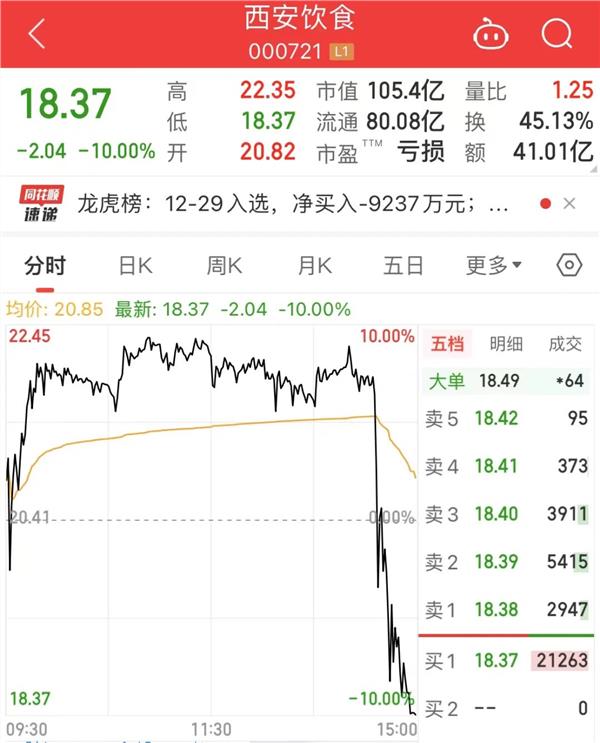 西安饮食从早盘涨逾9%到尾盘跳水跌停,尾盘主力资金净流出2.24亿元。英飞拓尾盘快速调整,一小时内最大跌幅超过11%;人民网尾盘也出现较大跌幅。