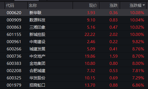 按照申万一级行业划分,房地产板块领涨,板块盘中涨幅超过4%,新华联、三湘印象、新城控股等股盘中冲击涨停。中南建设、中交地产、金地集团等股票也大幅上涨。