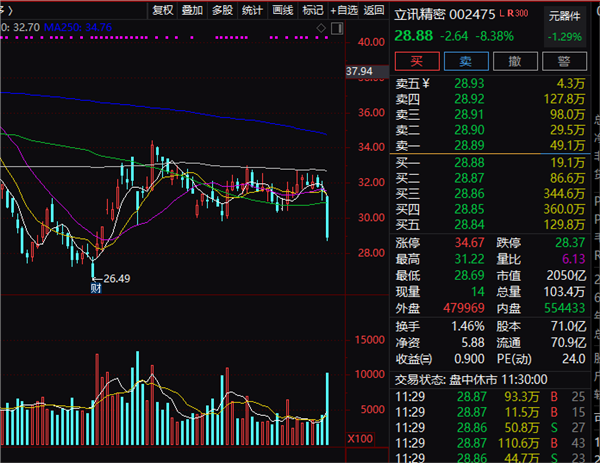 “果链”概念龙头股之一的立讯精密上午大跌,盘中一度大跌近9%。