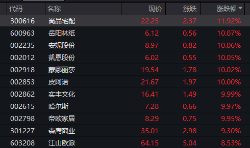 轻工制造板块大涨,盘中涨幅一度超过3%,尚品宅配盘中涨幅超过10%,蒙娜丽莎、皮阿诺、安妮股份等盘中涨停。