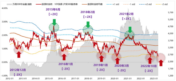 下图是天风策略展示的过往10年合计的6次股债收益差来到了-2X标准差的位置,分别是:2012年12月、2016年01月、2019年01月、2020年03月、2022年10月以及当下时点!可以看到,过去这几个位置基本对应的是沪深300的历史大底。