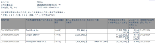 5月30日,摩根大通增持香港交易所(00388)647.1767万股,平均每股作价为263.7531港元,总金额约为17.07亿港元。增持后,最新持股数目为8006.0858万股,最新持股比例上升至6.31%。