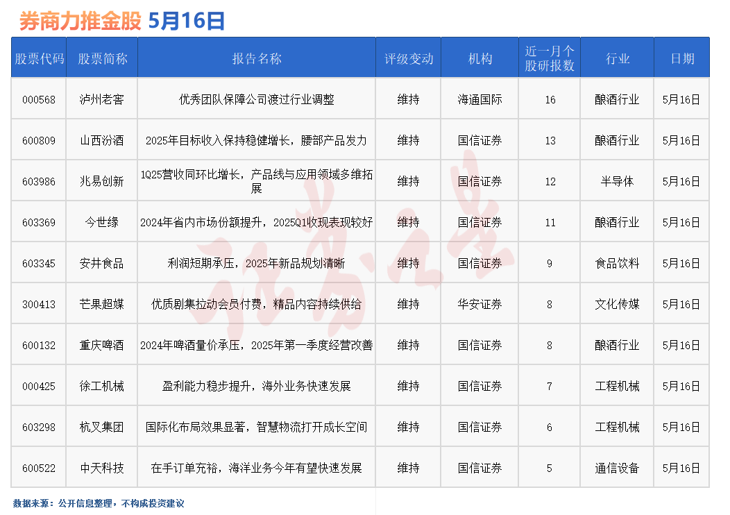 据证券之星数据库不完全统计,5月16日券商共给予超40家A股上市公司“买入”评级。从行业分布看,券商5月16日关注的个股聚焦于酿酒行业、半导体、食品饮料、文化传媒、工程机械、通信设备等行业。