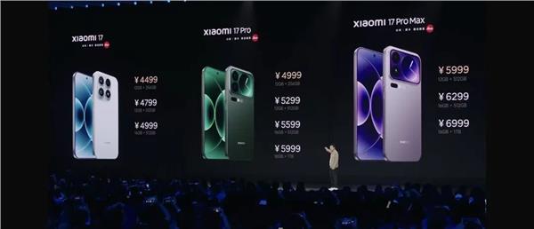 小米此次共发布三款手机:小米数字系列的小米 17,主打为小屏用户打造的旗舰手机,全球首发第五代骁龙 8 至尊版,配备 7000mAh 小米金沙江电池,徕卡 Summilux 光学系统,6.3 英寸大小,1.18mm 极窄四等边设计,提供四款配色,有三个配置可选——12GB+256GB:4499元、12GB+512GB:4799 元、16GB+512GB:4999 元。