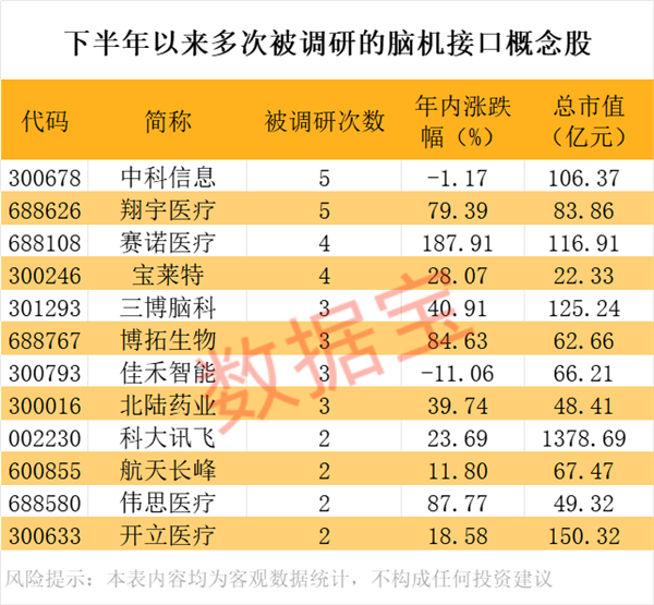 据证券时报·数据宝统计,下半年以来,多只脑机概念股获得机构调研。其中,翔宇医疗获得5次调研,在9月的调研中表示,公司“脑机接口技术+自有康复设备”的一体化产品整合优势,有望进一步提升公司的产品竞争力,可快速构建脑机接口多中心整体解决方案。