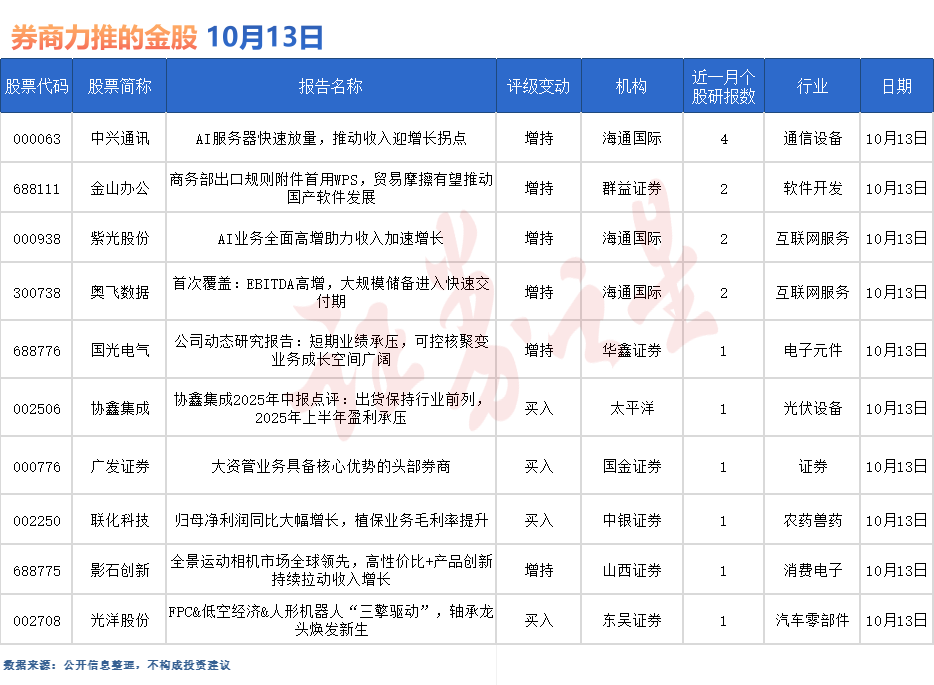 金山办公也备受券商关注,近一个月获西南证券等2份券商研报关注,位居券商10月13日力推股第二。