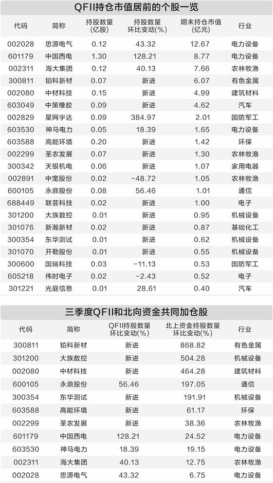 数据宝统计,在QFII新进或增持的个股中,有11股在三季度同样获得北向资金加仓,其中铂科新材、大族数控、中材科技获得北向资金持股数量环比增长超400%,且均为三季度QFII新进重仓股。