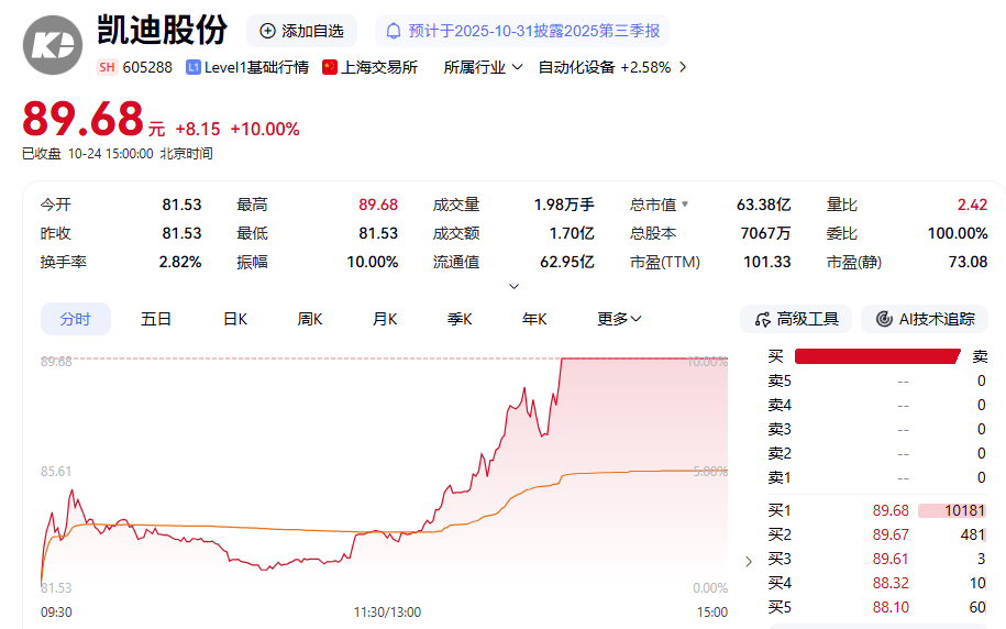 24日,电气部件与设备板块走强,凯迪股份午后拉升涨停,报89.68元/股。截至收盘,换手率2.82%,成交额1.7亿元。