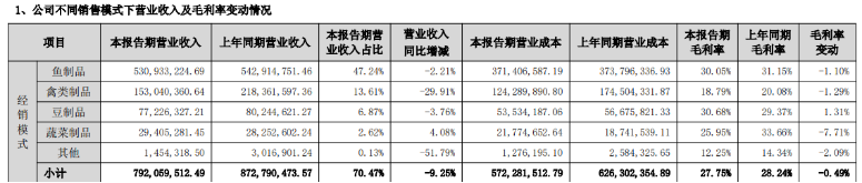 核心大单品“劲仔小鱼”是公司增长的主要动力,今年上半年,作为营收“压舱石”的鱼制品实现收入7.57亿元,同比增长7.61%,收入占比约为67.4%。站在当下节点,市场更关注的是,公司核心单品后续还有多大成长空间。