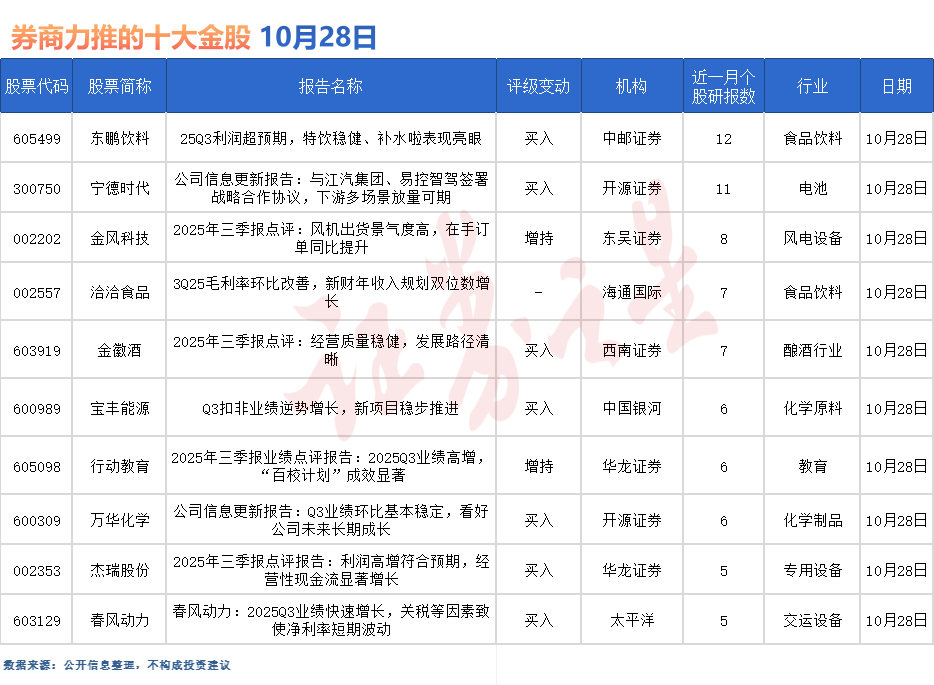 东鹏饮料最受券商关注,近一个月获万联证券、西南证券、华源证券、信达证券、东莞证券、华安证券、民生证券等12份券商研报关注,仅10月28日就有中邮证券和群益证券等两份券商研报,位居10月28日券商力推股榜首。