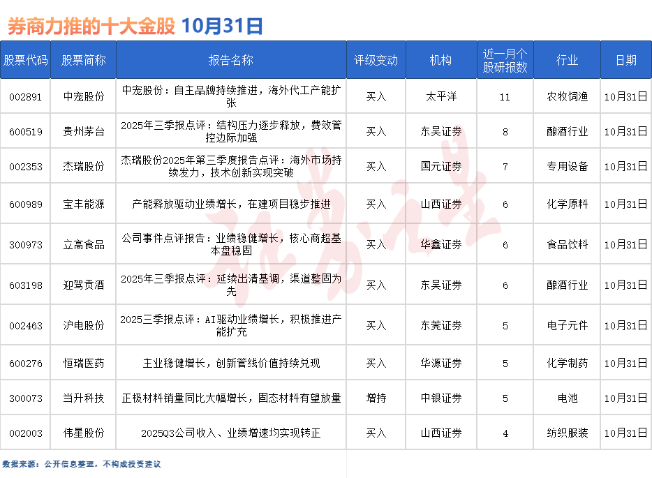 中宠股份最受券商关注,近一个月获华鑫证券、中原证券、中航证券、华龙证券、国金证券、信达证券、群益证券等11份券商研报关注,位居10月31日券商力推股榜首。