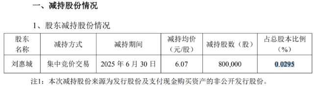 据公司9月发布的减持公告,刘惠城在2025年6月30日,以6.07元/股的均价,共减持80万股股份,减持比例为0.0295%。经计算,刘惠城此次减持共套现485.6万元。三季报显示,截至报告期末,刘惠城持股比例为6.13%,为公司第一大股东。