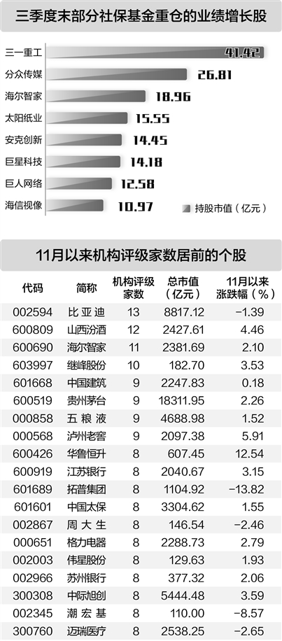 业绩增长股亦备受机构资金青睐,上述归母净利润同比增长的57股中,18股三季度末获得社保基金重仓,合计持股市值达到192.52亿元,其中三一重工、分众传媒、海尔智家社保基金持股市值居前,分别达到41.42亿元、26.81亿元、18.96亿元。
