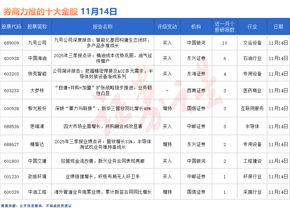据证券之星数据库不完全统计,11月14日券商共给予超10家A股上市公司“买入”评级。从行业分布看,券商11月14日关注的个股聚焦于交运设备、石油、专用设备、医药商业、互联网服务、半导体、工程建设、环保等行业。