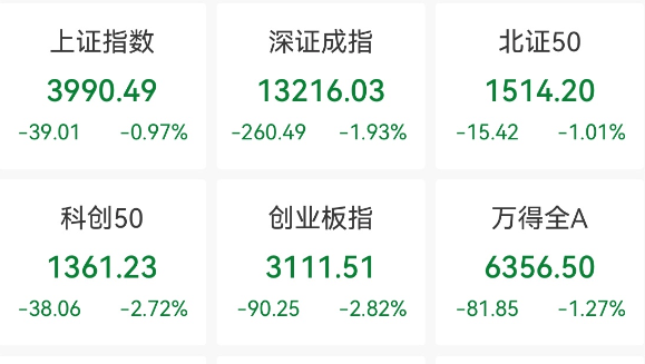 11月14日,A股市场全天震荡调整。截至收盘,上证指数下跌0.97%,失守4000点,最新报3990.49点;深证成指下跌1.93%,创业板指下跌2.82%。全市场1959股上涨,3320股下跌;成交额19803.82亿元,较昨日缩量约853亿元。