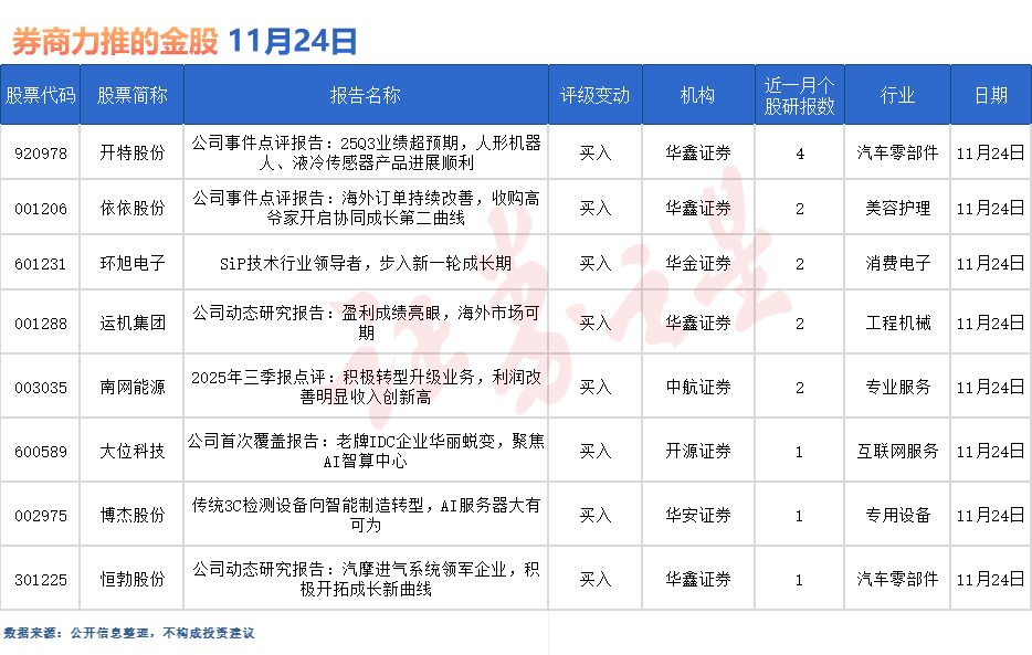 开特股份最受券商关注,近一个月获开源证券、东莞证券、东吴证券等4份券商研报关注,位居11月24日券商力推股榜首。