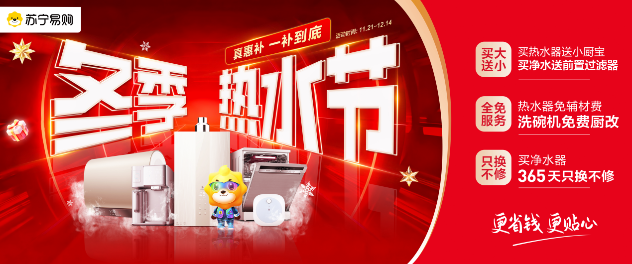 为满足消费者在冬季对厨卫电器的购买需求,苏宁易购加码冬季热水节活动,推出真惠补、热水器免辅材费、购热水器送小厨宝等权益和服务。在“真惠补”专场活动中,美的零冷水燃气热水器到手仅2449元、卡萨帝一级能效富锶燃气热水器低至5149元……苏宁易购表示,以“冬季热水节”为契机,将持续推动补贴和服务升级,激发市场消费新活力。
