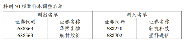 科创50指数样本股调入翱捷科技、盛科通信,调出华熙生物、航材股份。
