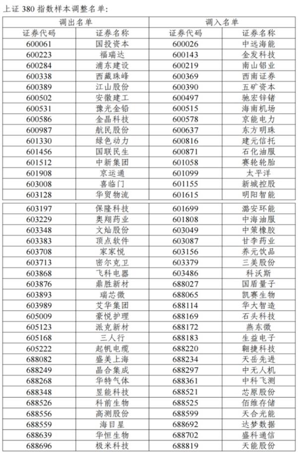 上证380指数样本股调入中远海能、金发科技、南山铝业、西南证券、五矿资本、驰宏锌锗、海南机场、京能电力、东方明珠、建元信托、石化油服等38只个股,调出国投资本、福瑞达、浦东建设、西藏珠峰、江山股份、安徽建工、豫光金铅、金晶科技、航民股份和绿色动力等38只个股。