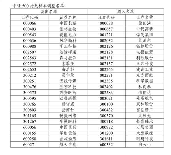 另据中证指数有限公司最新公布的定期调整方案,将调整沪深300、中证500、中证1000、中证A50、中证A100、中证A500等指数样本,此次调整为指数样本的定期调整,将于12月12日收市后正式生效。