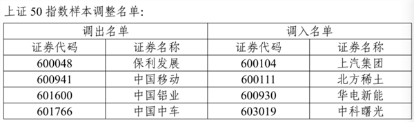 具体来看,上证50指数样本股调入上汽集团、北方稀土、华电新能和中科曙光,调出保利发展、中国移动、中国铝业和中国中车。