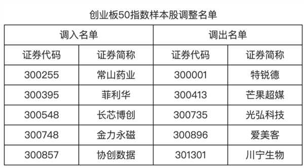 创业板50指数样本股调入常山药业、菲利华、长芯博创等5只个股,调出特锐德、芒果超媒、光弘科技等5只个股。