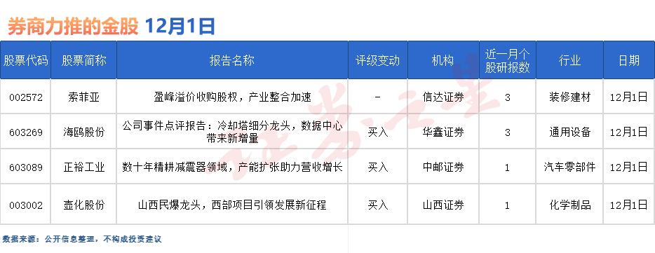 索菲亚最受券商关注,近一个月获国信证券、信达证券等3份券商研报关注,位居12月1日券商力推股榜首。