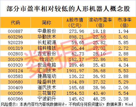 从估值水平方面来看,数据宝统计,截至12月3日收盘,上述36只人形机器人概念股中,滚动市盈率低于30倍的有5只,分别为中鼎股份、华勤技术、长虹能源、铭科精技、吉宏股份。