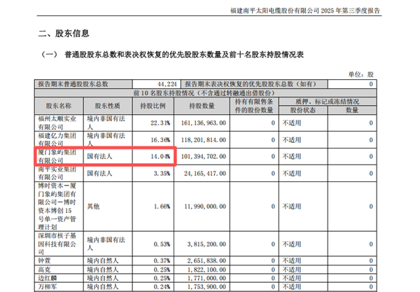 截至2025年第三季度末,象屿集团持有太阳电缆14.04%的股份,为太阳电缆第三大股东。