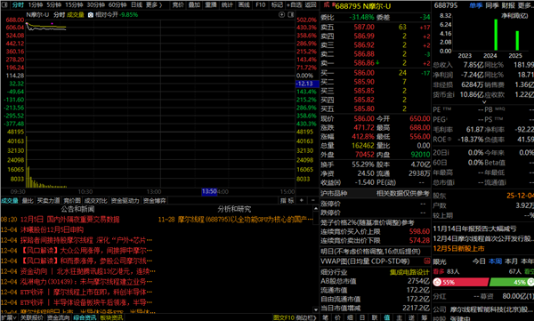12月5日,国产GPU领军企业摩尔线程正式登陆资本市场,开盘即以468%的惊人涨幅引爆市场,股价报650元/股,总市值突破3000亿元,盘中股价最高冲至688元,成为A股第三大高价股。根据开盘数据推算,投资者中一签可获利近27万元,创下近期新股盈利新高。