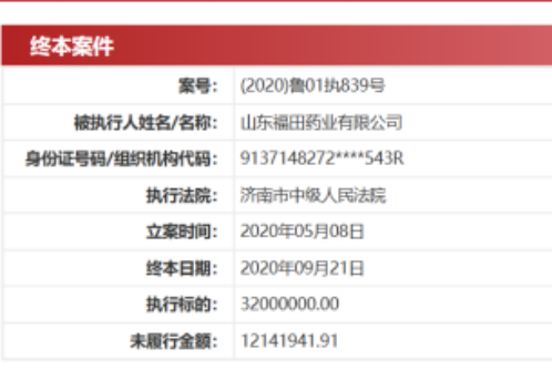 据中国执行信息公开网,福田药业存在两起被执行案件,立案时间为2020年5月的这起案件执行标的为3200万元,终本日期为2020年9月,未履行金额为1214.19万元;立案时间为2021年10月的另一起案件的执行标的为703.15万元,终本日期为2022年2月,未履行金额为702.8万元。