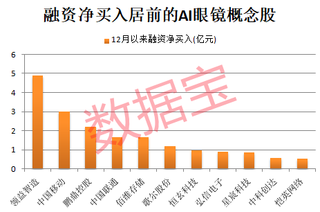 资金面上,数据宝统计,截至12月8日,12月以来融资净买入超1亿元的AI眼镜概念股有6只,分别是领益智造、中国移动、鹏鼎控股、中国联通、佰维存储、歌尔股份。
