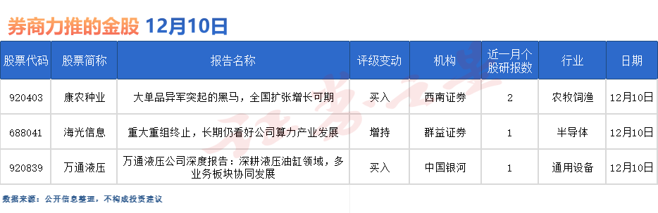康农种业最受券商关注,近一个月获开源证券等2份券商研报关注,位居12月10日券商力推股榜首。