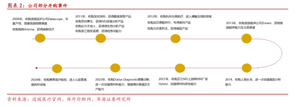 例如2008年并购美国Datascope,开启了全球化并购的序幕,获得Datascope监护产品及美国、欧洲的销售平台和服务网络。2013年对美国Zonare和2021年对HyTest Ltd的两起收购,分别实现了在高端影像和体外诊断(IVD)原料领域的关键突破。
