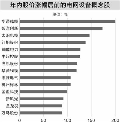从个股来看,10只电网设备概念股年内累计涨幅超100%,包括华通线缆、智洋创新、太阳电缆、红相股份等。华通线缆年内累计涨幅近200%,排在首位。公司是我国电缆制造业中研发与工艺技术领先的企业之一,已取得美国UL、欧盟CE、德国TUV等多项国际认证,以及中国CRCC、CCC等国内强制性认证,是我国获UL认证大类最全的企业之一。