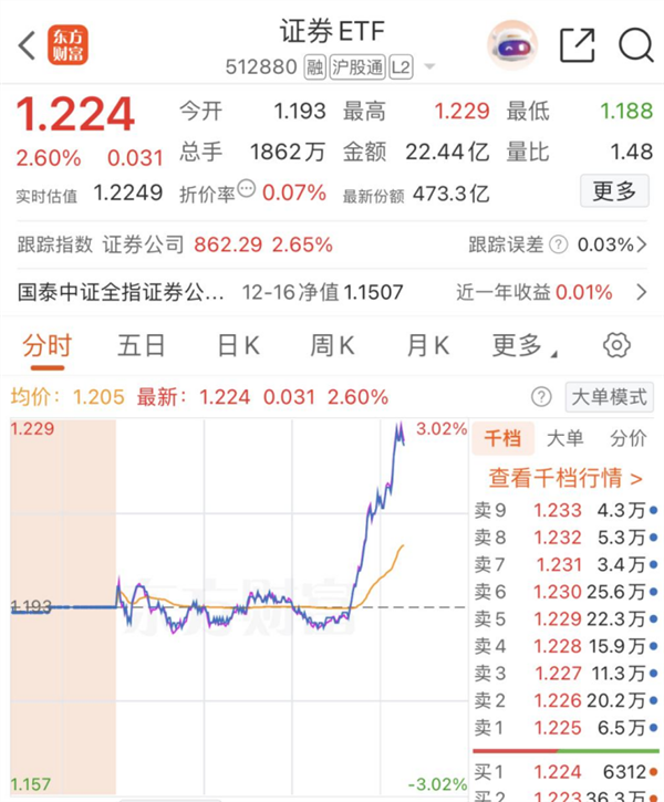 今日(12月17日)午后,上证指数直线拉升,一度涨近1.5%;创业板指一度涨逾3.5%,券商、保险、软件板块拉升。其中券商股表现最为明显,证券ETF一度大涨超3%,为市场带来人气。