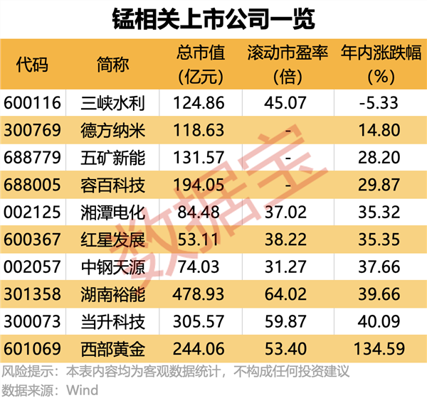 据证券时报·数据宝统计,锰产业概念股主要包括三峡水利、红星发展、湘潭电化、西部黄金、中钢天源等。