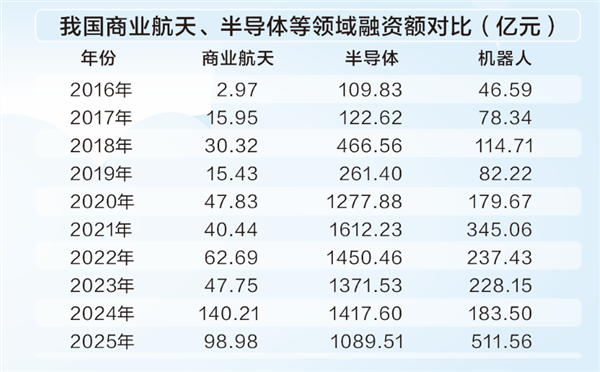 然而,对比近十年我国半导体领域超9000亿元的融资额,机器人领域超2000亿元的融资额,商业航天的融资额远低于上述两者。已启动IPO的SpaceX公司,拟募资额或远超300亿美元,我国商业航天的融资力度明显不足。