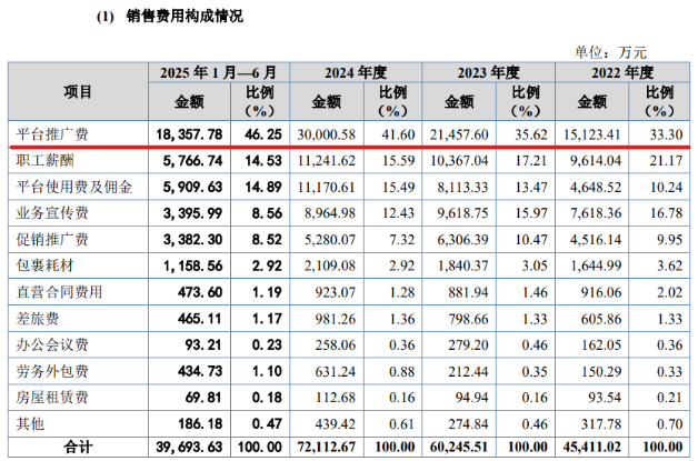 报告期内,英氏控股的销售费用由2022年的4.54亿元上升至2024年的7.21亿元,今年上半年达到3.97亿元,其中各期平台推广费分别高达1.51亿元、2.15亿元、3亿元以及1.84亿元,占销售费用的比重由期初的33.3%增长至期末的46.25%。