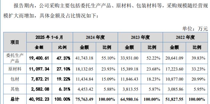 英氏控股在招股书中披露,其核心产品米粉直至2025年才实现完全自主生产,而包括婴幼儿辅食、儿童食品、营养食品及少量卫生用品在内的其余产品,仍主要采用委托生产模式。报告期内,公司委托生产采购占比呈波动上升趋势,从期初的39.83%升至2024年的55.10%,2025年上半年虽回落至47.37%,但仍处于较高水平。
