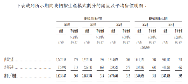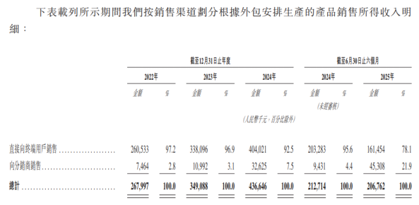 然而,外包产品的高溢价趋势正在发生变化,其平均售价已从2022年的713元/千克回落至2025年上半年的462元/千克。公司解释称,旗下产品“特爱敏佳幼儿”(平均售价较低)的销量增速高于其他产品,带动外包生产比例持续上升。同时,截至2025年6月30日的六个月内,公司向分销商销售的外包生产产品不断增多。