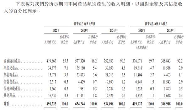 报告期内(2022年至2024年以及今年1至6月),公司营收高度依赖过敏防治产品,各期营收占比分别为85.5%、88.2%、90.3%以及92.2%,然而该核心业务的增长势头在上半年“戛然而止”,收入同比下滑2.66%至3.66亿元,不仅如此,来自早产儿产品和无乳糖产品的收入分别同比大幅下滑40.82%和61.40%,受多产品线市场表现疲软影响,圣桐特医上半年的营收规模同比下滑5.25%至3.97亿元。