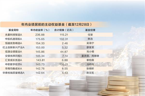 截至12月28日,公募主动权益基金年内最高收益率达到236.88%,不仅锁定了年度冠军位置,还可能刷新业绩纪录,成为公募史上年度收益最高的翻倍基。