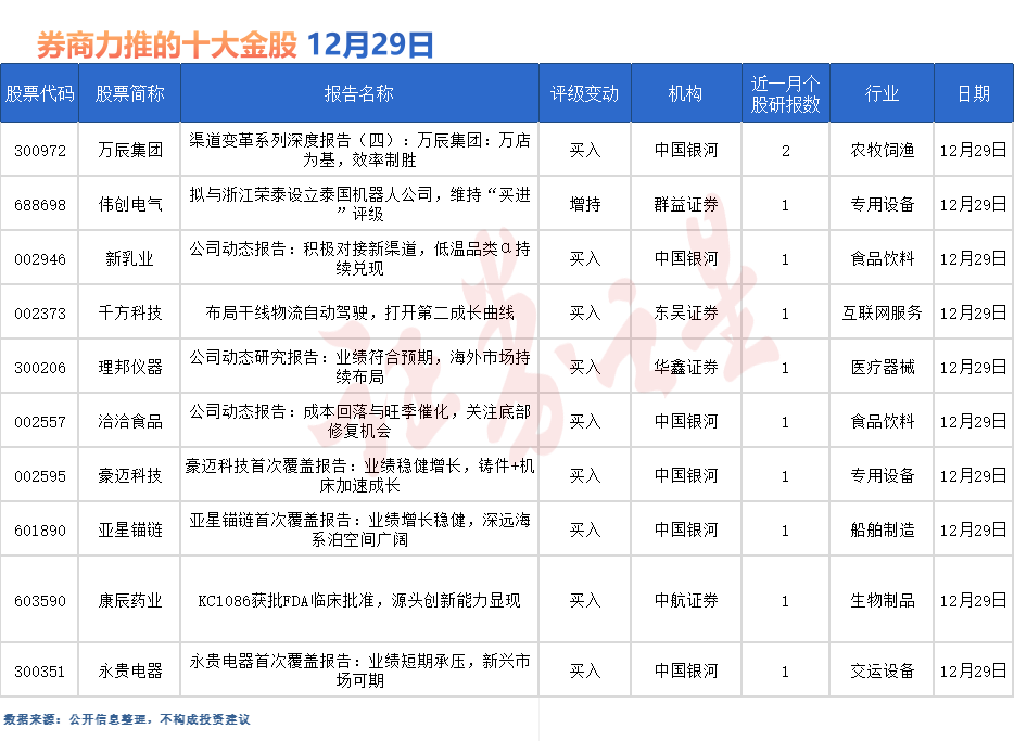 零食量贩万店巨头——万辰集团最受券商关注,近一个月获爱建证券等2份券商研报关注,位居12月29日券商力推股榜首。