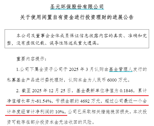 根据圣元环保公告披露,公司下属全资子公司厦门金陵基建筑工程有限公司(以下简称“厦门金陵基”)投资的“深博宏图成长1号私募证券投资基金”(以下简称“宏图成长1号”)出现重大亏损,亏损金额高达4692万元。虽然公司已采取相关措施挽回损失,但可能存在部分投资本金无法收回的风险。