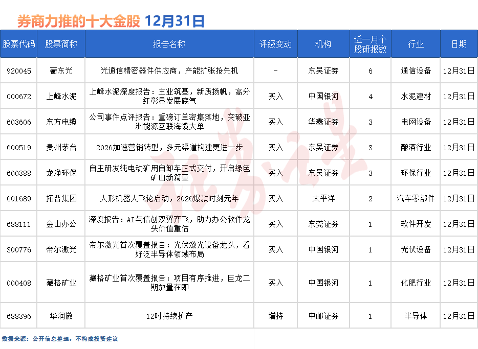 据证券之星数据库不完全统计,12月31日券商共给予超10家A股上市公司“买入”评级。从行业分布看,券商12月31日关注的个股聚焦于通信设备、水泥建材、电网设备、酿酒、环保、汽车零部件、软件开发、光伏设备等行业。
