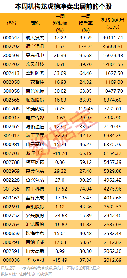 其中净卖出金额最多的是航天发展,本周累计上涨17.22%,一周换手率为99.59%,因日换手率达42.53%、日涨幅偏离值达10.31%、日涨幅偏离值达10.33%等3次上榜龙虎榜,买卖居前营业部中机构合计净卖出4.01亿元;同时上榜的还有深股通专用席位,净买入8.5亿元,营业部席位一周合计净买入1793.11万元。